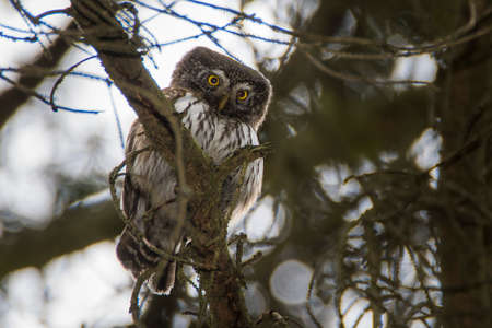 The Eurasian Pigmy On a bright spring day, an owl perches in a fir wood