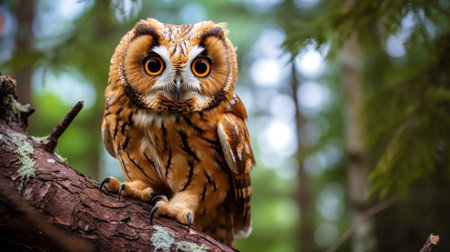 Striking owl perched amidst lush greenery during early morning hours in a serene forest