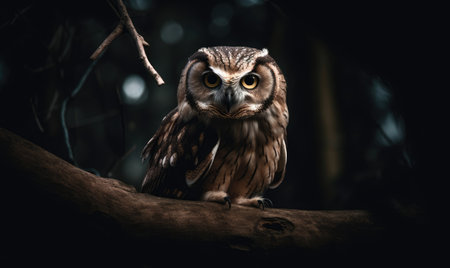 Wise owl with impressive feathers sitting on a tree branch. Creating using generative AI tools