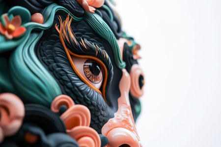 Intricate clay sculpture of colorful animal mask with detailed eye and floral decor.