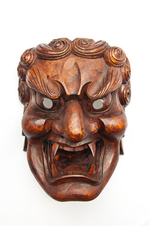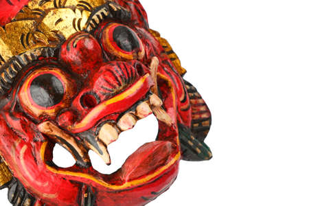 Asian traditional wooden carved painted red mask with face of human or demon isolated on white background, crop