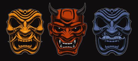 Set of vector Japanese masks of samurais isolated on the dark background.