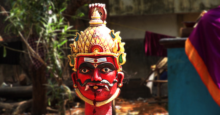 a traditional thai demon wooden mask on sale as a souvenir in the damnoen saduak floating market