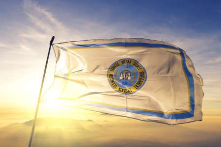 The national flag of the US state Tennessee in against a gray smoke on the day of independence in different colors of blue red and yellow. Political and religious disputes, customs and delivery.