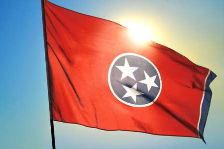 Tennessee state of United States flag waving on the wind in front of sun