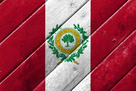 Flag of the city of Raleigh, North Carolina, USA, on a background of a wooden fence. Conceptual collage.