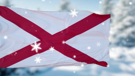 Alabama winter snowflakes flag background. United States of America. 3d illustration