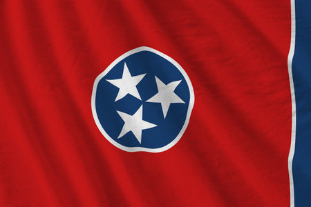 Tennessee US State flag waving on wind. United States of America Tennessee background fullscreen flag blowing on wind. Realistic fabric texture on elevator day.