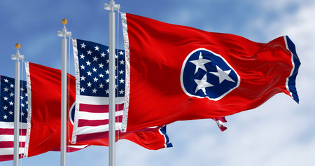 Tennessee state flag waving with the american flag on a clear day. Three white stars inside a blue circle on a red background with a white stripe and a blue band on the right. 3d illustration render