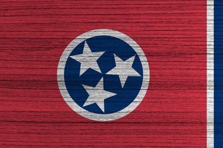 Tennessee US state national flag on a gray wooden boards background on the day of independence in different colors of blue red and yellow. Political and religious disputes, customs and delivery.
