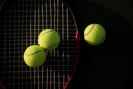 A shot of tennis racquet and tennis balls on a tennis court