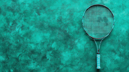 This captivating image features a vintage tennis racket on a vibrant teal surface, ideal for sports enthusiasts and fitness aficionados seeking inspiration.