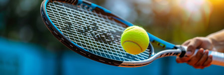 Close-Up of Tennis Racquet Hitting Ball, Evening Lights, Sports Concept with Copy Space
