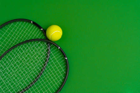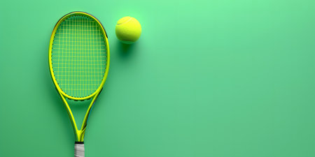 banner,tennis racket with a ball on a green background in ,place for text,concept of sports materials,news posters and posters,advertising of sports equipment