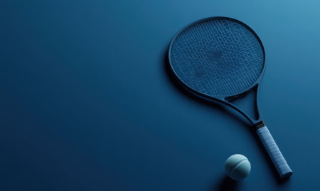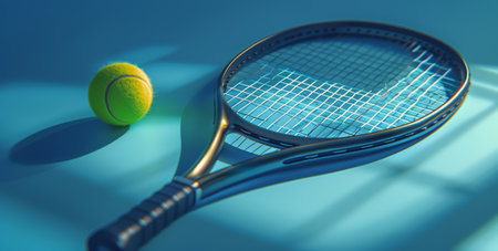 A dynamic composition features a tennis racket and a yellow ball placed on a cool blue surface, casting intriguing shadows that enhance the visual impact.