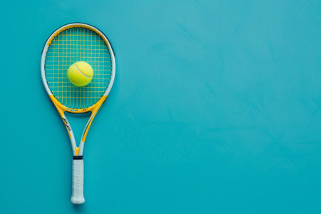 A close-up view of a tennis racket against a smooth turquoise background. This image embodies the spirit of sport and fitness, showcasing minimalist design and vibrant color.