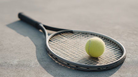 A close-up of a tennis racket resting on a concrete surface with a vibrant yellow tennis ball nearby, capturing the essence of sportsmanship and outdoor fun.