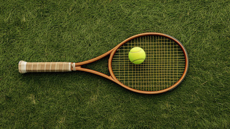 a wooden tennis racket and ball placed on a grass tennis court, executed in a minimalist style, capturing the essence of the sport with simplicity and elegance