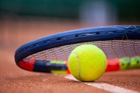 Tennis racket and ball on a tennis court. Selective focus.