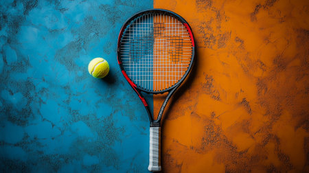 Tennis racket and ball on orange and blue background. Top view