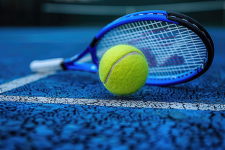 A vibrant tennis racket and a bright yellow ball resting on a blue court surface, showcasing the excitement and energy of the sport in an inviting scene for fitness enthusiasts.