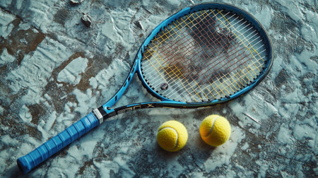 A blue tennis racket rests besides two yellow tennis balls on a textured surface, illuminated by soft light, suggesting a moment of play or practice waiting to begin.