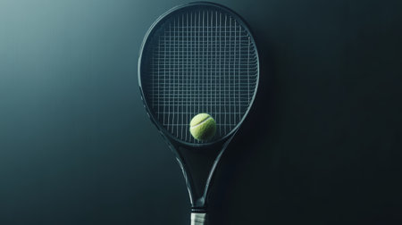 Tennis racket holding a fluorescent yellow tennis ball against a dark, textured background, creating a dramatic and sporty image with copy space