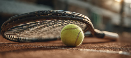 Tennis racket and ball close-up lying on tennis court. AI generative. Background for advertising or website.