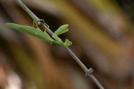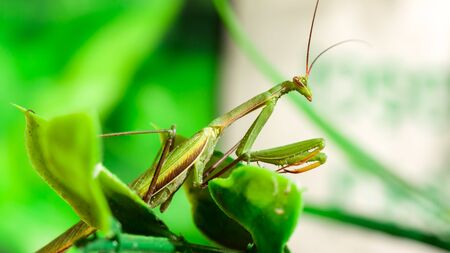 Closeup of Praying Mantis standing still on a branch. Macro image of Flower mantis.