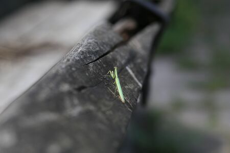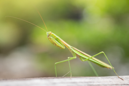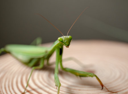 A close-up of a green praying mantis on a wooden surface, showcasing its detailed features and vibrant color
