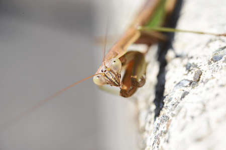 Macro shot of a Praying Mantis on a street's pavement, looking at the camera. Shallow depth of field.