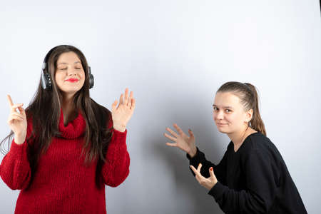 Portrait of two young beautiful hipster girls in trendy colorful summer clothes isolated on white background. Crazy positive bright teens