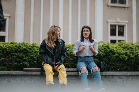 Two girlfriends striped T-shirts fashion emotions communication conflict quarrel