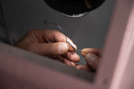 The technician solders the metal frame of the glasses.
