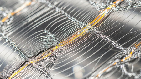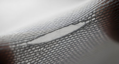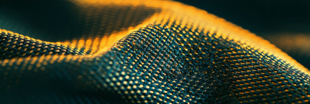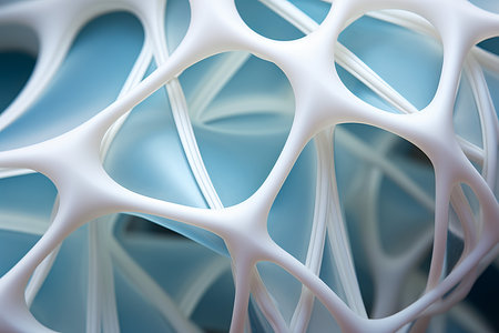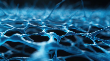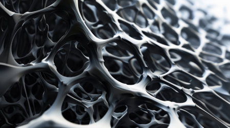 Futuristic close-up of synthetic mesh structure in silver-blue tones, representing biotech innovation, science and artificial skin