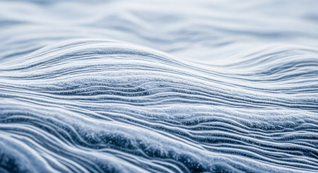 An abstract close-up reveals the intricate wavy patterns and textures of a frozen ice surface.