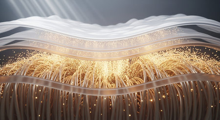 showing microscopic view of layered skin structure with glowing golden fibers and sparkling particles, illuminated by soft light rays.
