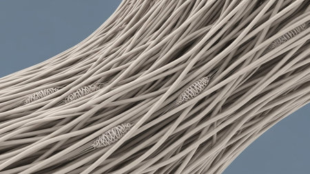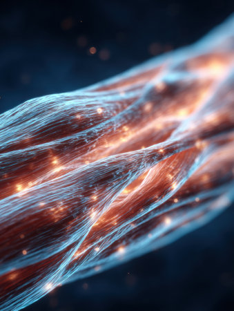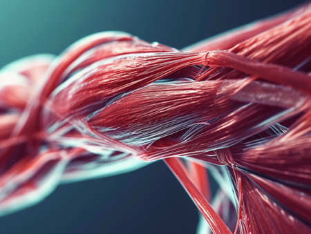 Intricate muscle fibers are displayed in a macro view, revealing a blend of textures and luminous details that highlight their complexity and structure.