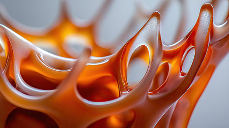 Detailed close-up view of a dynamic amber liquid splash, showcasing its intricate and organic forms. The image emphasizes the texture, vibrant color, and detailed structure of the liquid in motion. The lighting highlights the translucent qualities of the liquid, creating a captivating interplay of highlights and shadows.