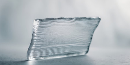 Stacked layers of translucent ice slabs with trapped air bubbles, creating a textured background.