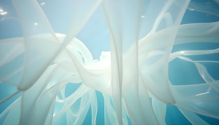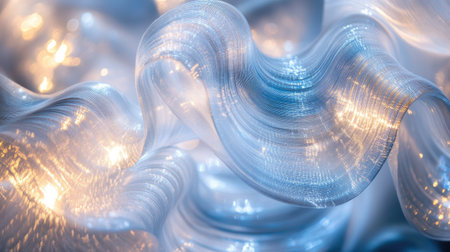 Transparent blue and teal ribbons flow and intertwine in a fluid abstract composition, reflecting light against a soft, blurred gradient background.