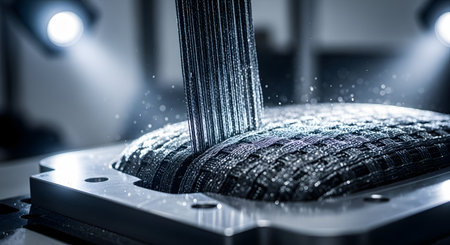 A close-up, industrial shot of an advanced manufacturing process, possibly 3D printing or weaving with carbon fiber. Strands of material are being deposited or woven into a complex, dark, textured part under bright spotlights.