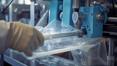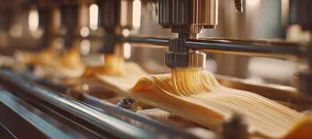 Close-up image of fresh pasta being extruded and cut by automated machines on a stainless steel production line. The warm, appetizing tone highlights the precision of modern food manufacturing.