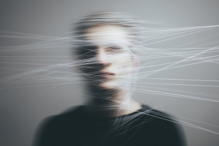 conceptual surreal portrait of a woman with her face obscured by abstract blurred lines. the image symbolizes inner turmoil, anxiety, and identity crisis. minimal and emotional artwork.