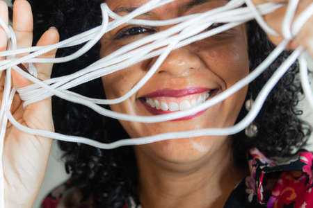 Close-up of a woman's face wearing colorful dress with drawstring in hands against light gray background. Salvador, Bahia, Brazil.