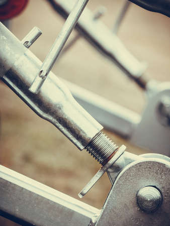 Agriculture equipment concept. Industrial detailed pneumatic, hydraulic machinery made of steel closeup