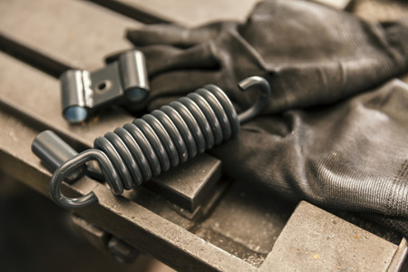 Pump, device, detail closeup concept. Big, hard made of steel spring on machinery