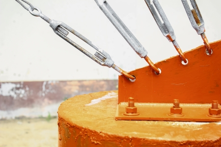 The end knot of steel rope. Stainless steel turnbuckle and sling steel in base. Detail of steel bolt anchor eye in ground