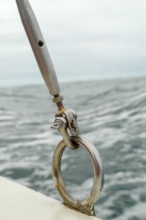 Metal fastening of the braided rope, screed of the cable on the bolts, the ring holds the tension of the iron cable. high quality photo
