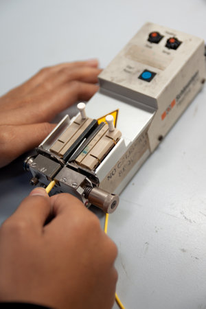 Technician cleaving an optical fiber, a crucial process for a good fusion of optical fibers.